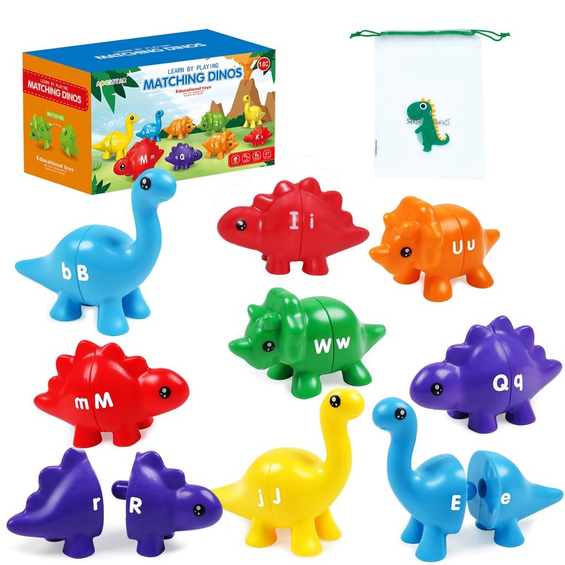 - [Alphabet Cognition Matching Game] This Eye-catching letters matching dinos toy set comes in 13 Double-sided pieces dinos in 6 different colors. Kids know their ABC and colors when they mix, sort & match, snap, and identify the dinosaurs.