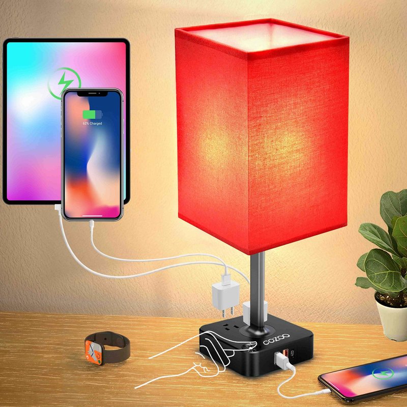 cozoo USB Bedside Table Desk Lamp with 2 USB Charging Ports and 2 Outlets Power Strip,Dimmable Table Lamp with White Fabric Shade, LED Light for Bedroom/Nightstand (Red)