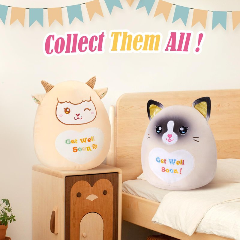 - UNIQUE RAGDOLL CAT: The get well soon plush pillow is designed as a cute Ragdoll cat image, Its whole body is off white, and there is a big round belly with "Get Well Soon" written on it. Its light yellow ears bring a touch of brightness, and children will love it.