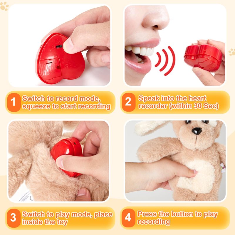 - EASY TO USE: This magic puppy can record and repeat what you say. When you first receive the plush toy, take out the electronic voice recorder in this puppy, remove pull tab to activate the batteries. Then slide the switch to the recording mode, speak to the microphone up to 30 seconds, then slide the switch to the playback mode, and squeeze it to repeat what you have said. This voice recorder is equipped with 3 LR1130 (AG10) batteries, if the battery ever dies, you can change it out and can easily be purchased locally or online. (See the attached instructions for details).