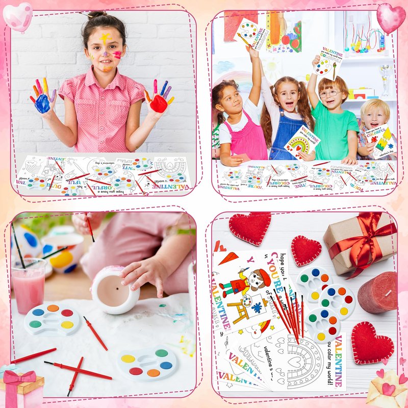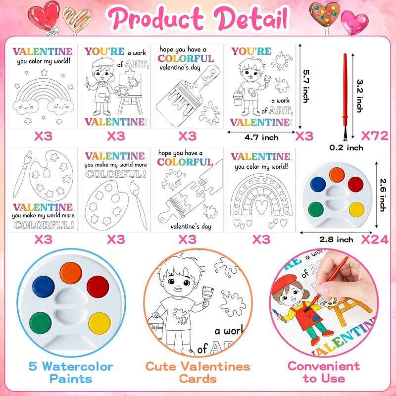- Mini Watercolor Paint Set - You will get 24pcs coloring Valentine’s Day gift cards and 24pcs kids watercolor paint set bulk. Each set includes a 5-color paint tray and 3 painting brushes. Enough to meet your different needs.