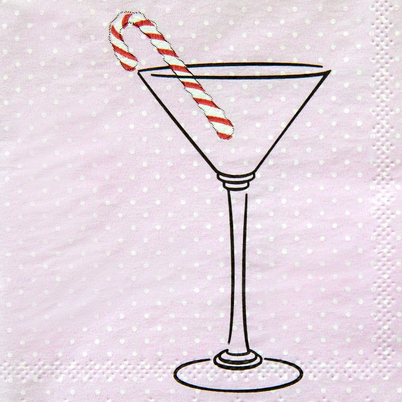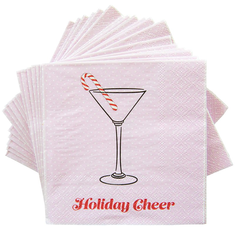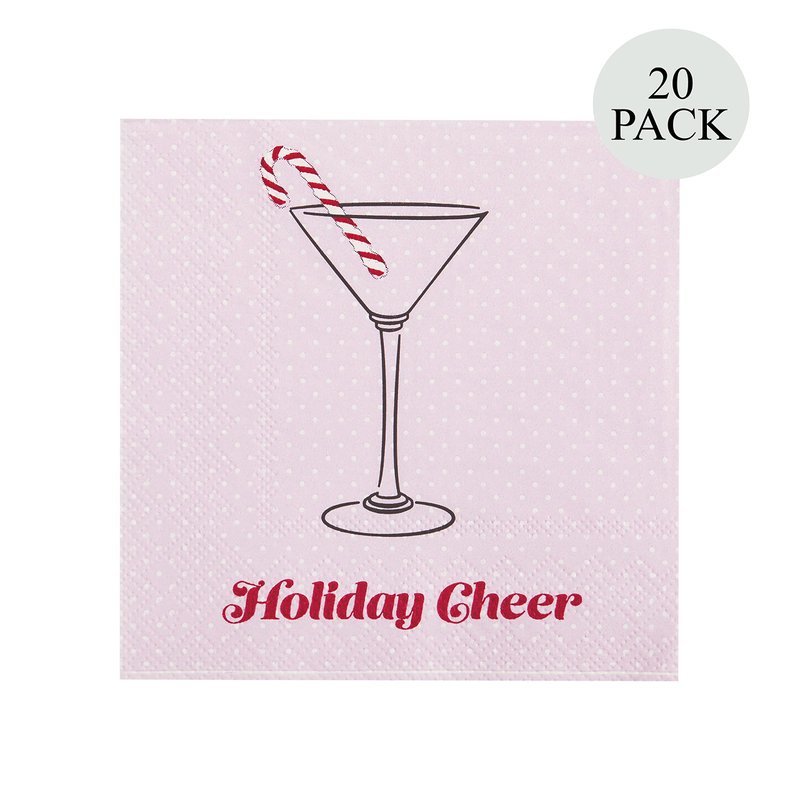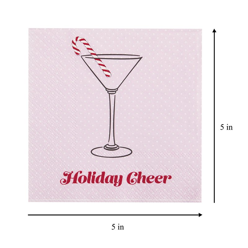 - These decorative cocktail napkins feature a pink and white polka dot base with a festive sentiment and cute imagery of a candy cane in a martini glass.