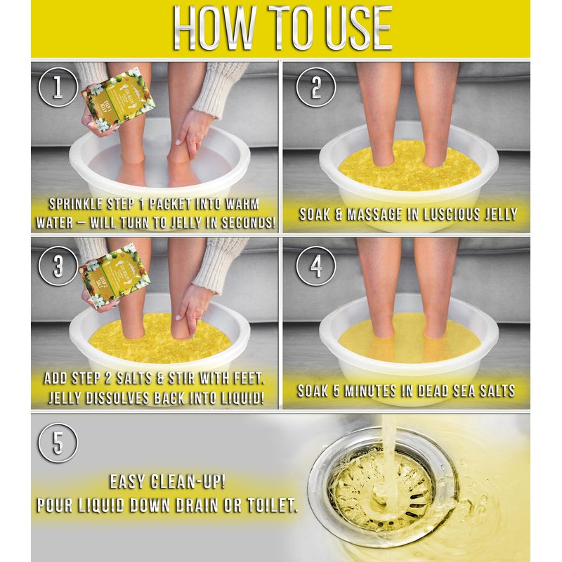 - SAY NO TO THROWING YOUR MONEY AWAY AT EXPENSIVE SALONS that are unclean, rush and overcharge you! Your solution is our 3 jelly pedicure packs for less than 1 spa jelly foot soak for pedicure service at the spa. INDULGE in WARM therapeutic SOOTHING spa water gel that is here to soften calluses & coat your tired feet & toes as you sit right at home in your pajamas! Have a foot soak spa day of relief right at home for your daily remedy! Your feet need our foot spa gel!