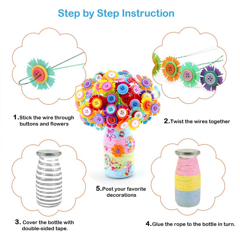 - Comes with everything you’ll need to make 2 beautiful flower bouquets - tons of felt flowers, colorful buttons, strings, 2 glass vases, gem stickers, etc