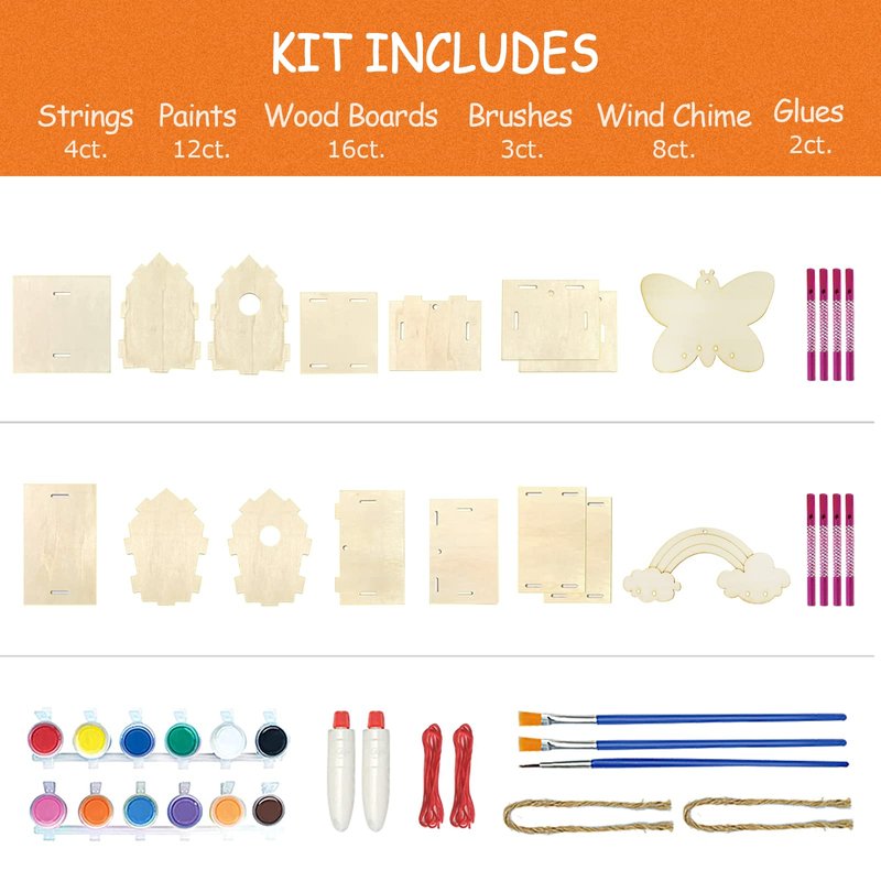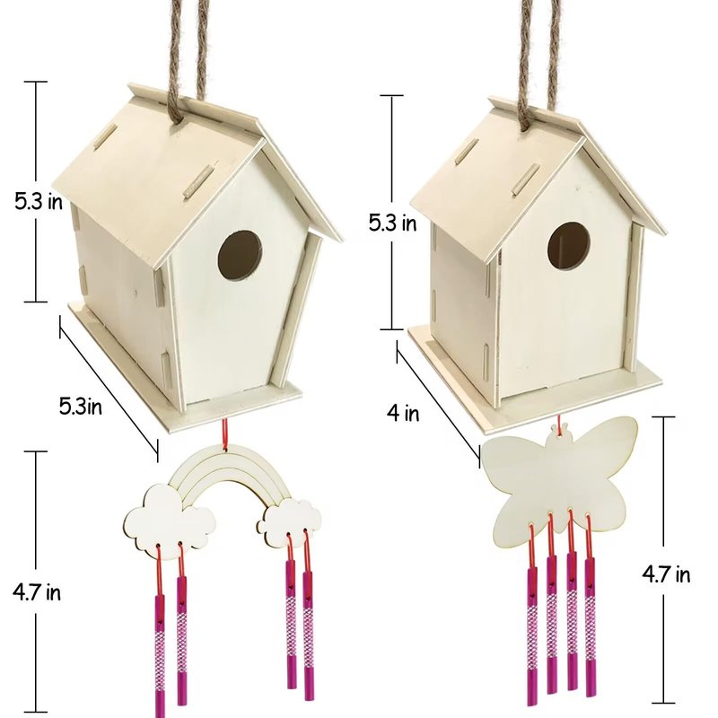 - Package includes 2 unassembled birdhouse, 2 wind chime, 12 paints, 3 brushes and 4 strings