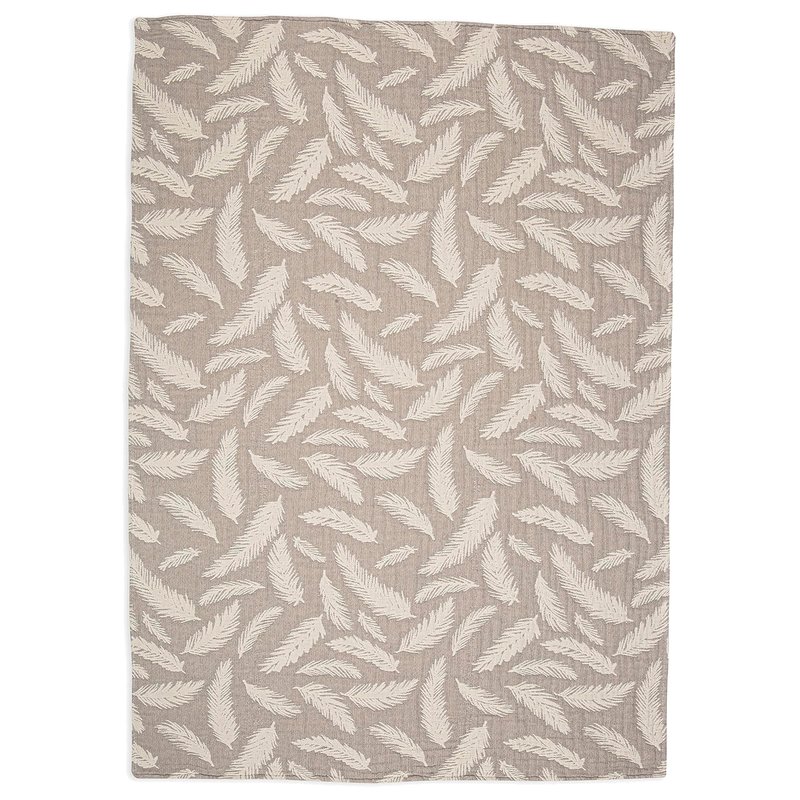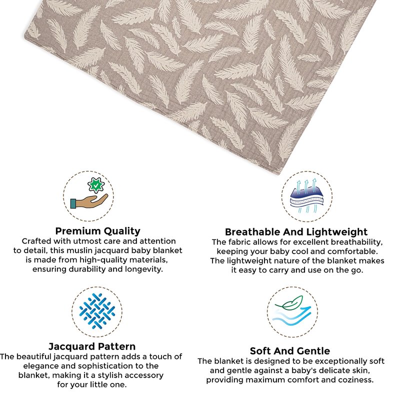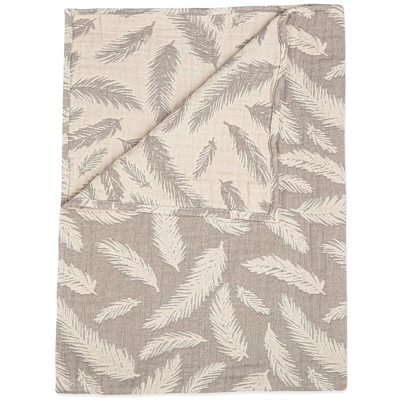 - SIZE: One 30” x 40” cotton muslin baby blanket in grey feather print