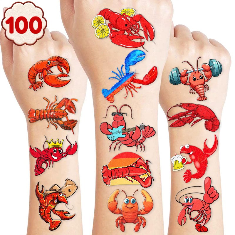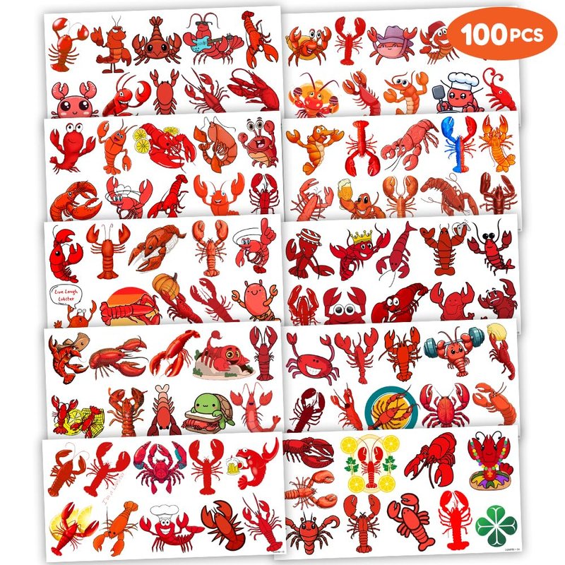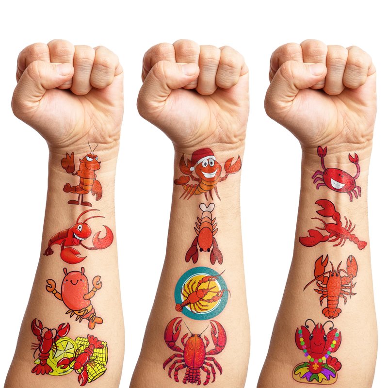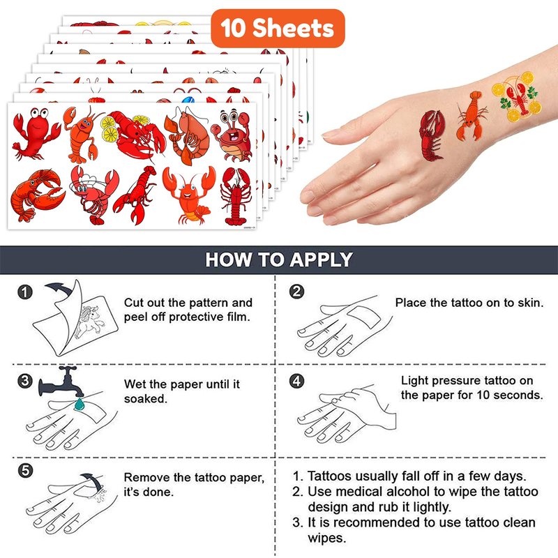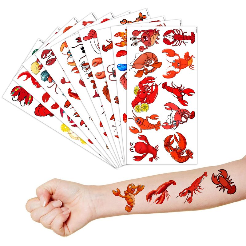 - What You Get: We would like to provide you with ten sheets tattoos for, including various styles, sufficient in quantities and styles to meet your daily requirement of using and decorating. You can easily use this set of Cute Crawfish party decorations with this Lobster temporary tattoos and take unique photos to make fond memories. The size of each sheet is 6.1 * 3.1 inches.