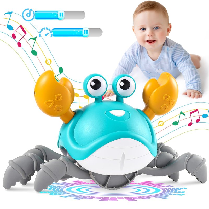 - Tummy Time Baby Toys 6-12 Months: Our baby toys 6-12 months have bright colors, sparkling lights, and cheerful music. When crawling crab sideways walking around baby, tummy time crab lively action and interactive features attract babies' attention and encourage babies to crawl, waving their arms and legs following the music, while enhancing their motor skills and sensory development during play
