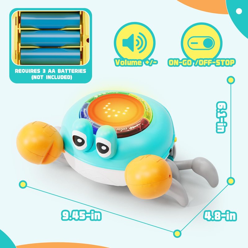 - CRAWLING CRAB BABY TOY: Switch on the crawling crab baby toy, is vivid and noisy run away, encouraging babies to crawl; The display shows where the crawling crab is moving, right or left, subtly teaching direction to babies; With obstacle avoidance features on both sides, the baby crawling crab always keeps little ones crawling in a safe area