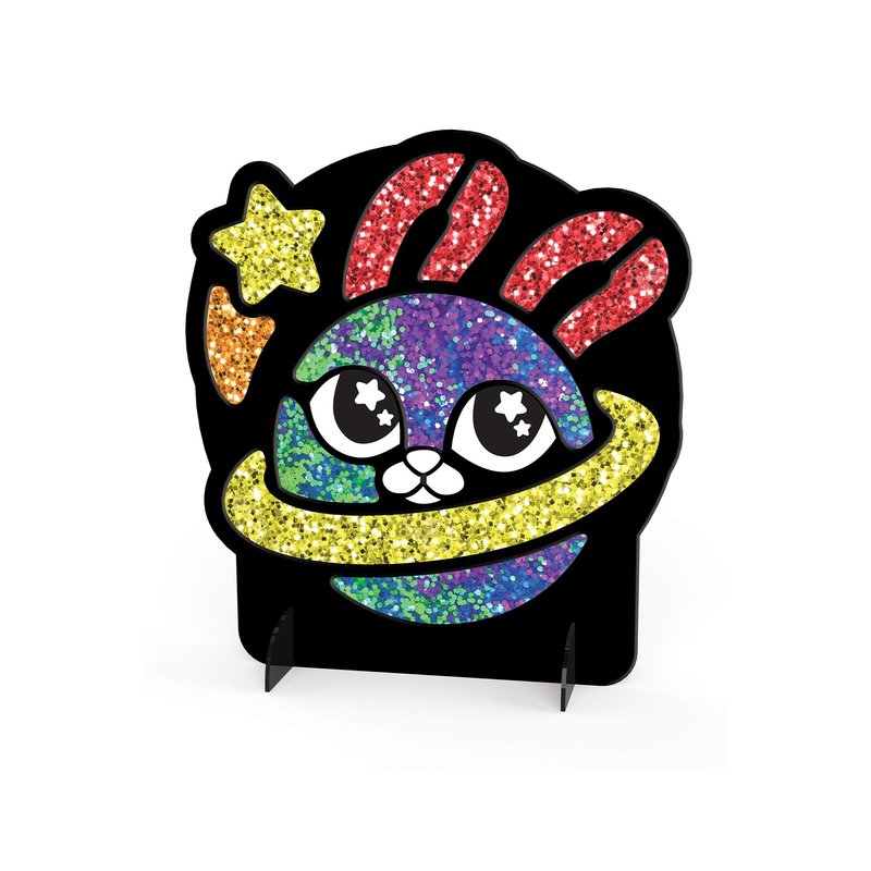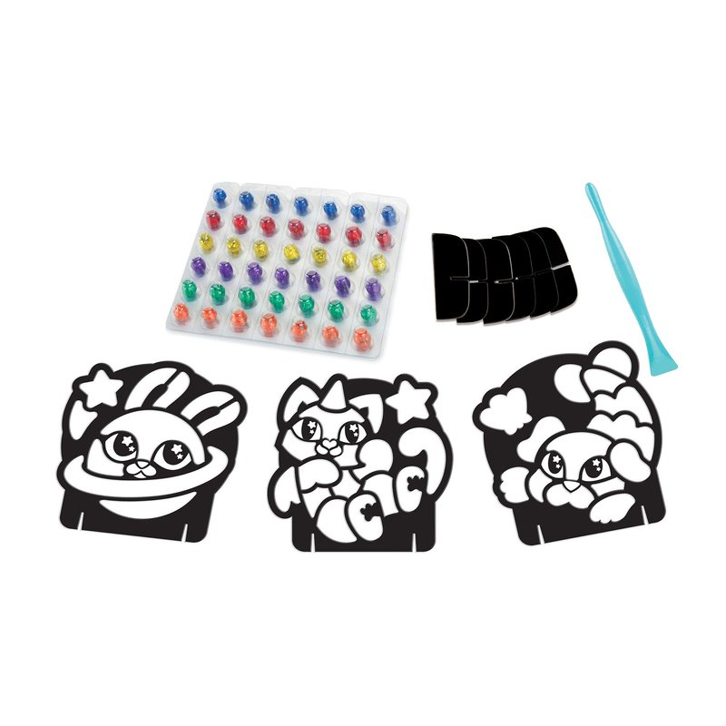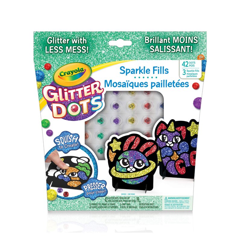 This is a new way of working with glitter. Press the dots into the mosaics that are included for color and to make the mosaic sparkle. Comes with 42 color dots and a stand to display your work of art. The dots also help clean up the glitter at the end of the art session.