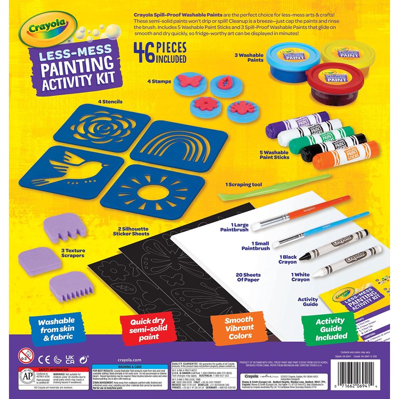 - CRAYOLA ART KIT: This 46 count Crayola Art Set for Kids includes 5 Washable Paint Sticks, 3 Spill Proof Paints, 1 Black and 1 White Crayon, 2 Stencil Brushes, 4 Foam Stampers, 3 Foam Texture Scrapers, 4 Stencils, 2 Silhouette Sticker Sheets, Scraper Tool, 20 Sheets of Paper & Instruction Idea Guide.