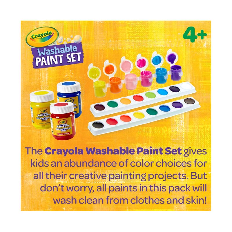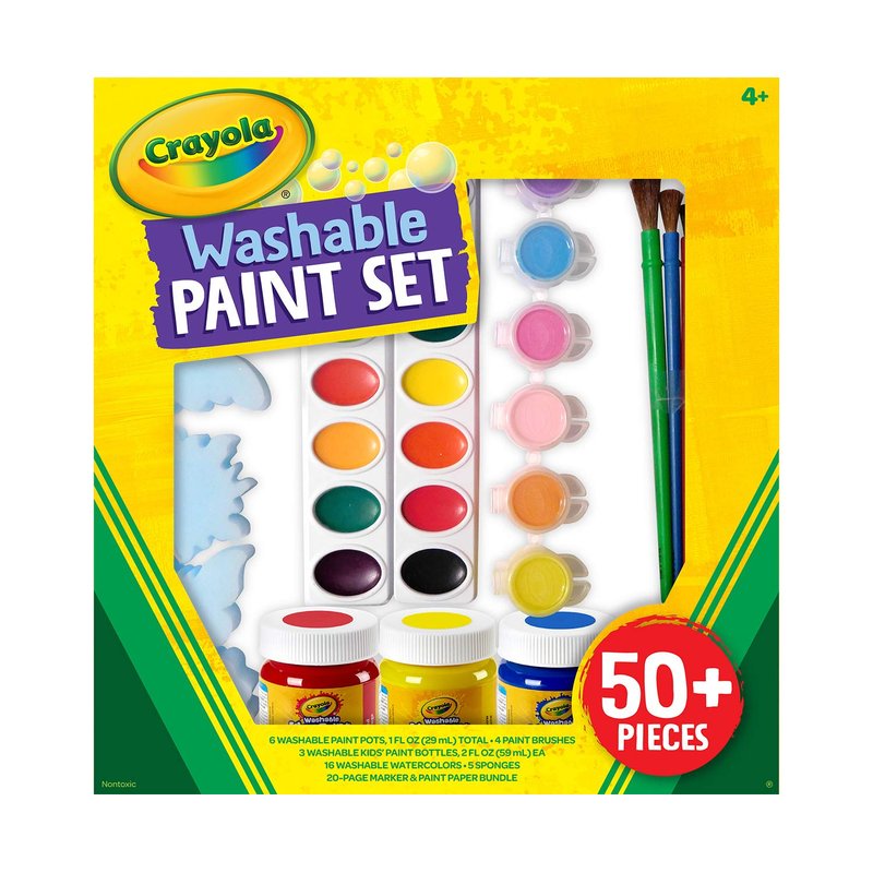 - WASHABLE PAINT SET: Features over 50 pieces, including 3 (2 oz) Washable Paints, 6 Washable Paint Pots, 4 Paint Brushes, 16 Washable Watercolors, 5 Sponge Shapes, and 20 Sheets of Painting Paper.