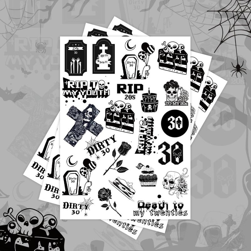 - 【Unique Design】These 30th bday temporary tattoos are designed with funny funeral elements, such as tomb,skull,cake, flowers,You can apply these fake tattoos on your face, arms, neck, back and other body parts.