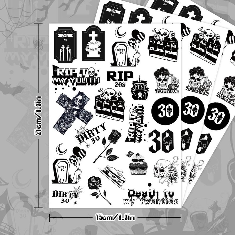 - 【Perfect Party Accessory】a fun addition to 30th birthday party decoration! Each sheet measures 8.25 " x 6 " creating the perfect size tattoos!