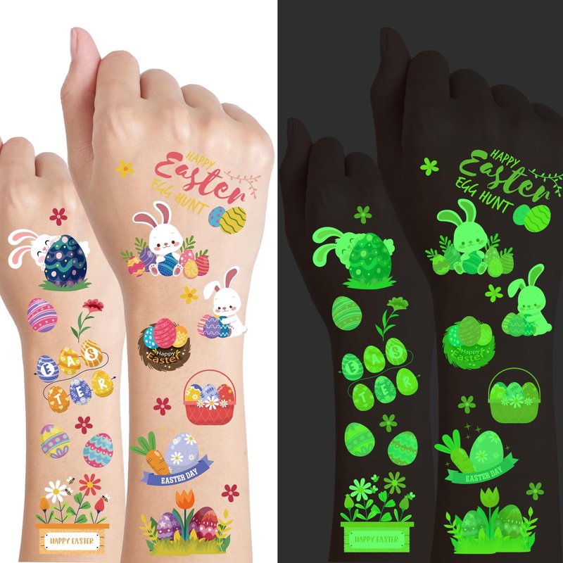 - 【Luminous Easter Tattoos for Kids Party】You will receive 3 sheets temporary tattoos-75 Glitter Style.Various luminous Easter temporary tattoos for kids with rabbits, Easter eggs, flowers, chicks, and other favorite patterns that kids will love! These glow tattoos will make you unique in the crowd!