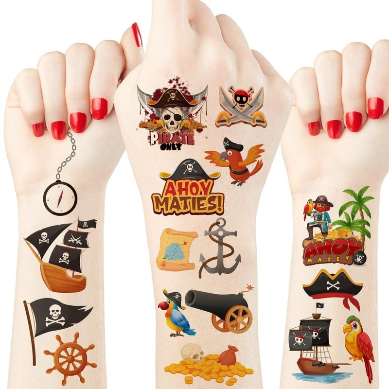 - 【Unique Design】These pirate party temporary tattoos are designed with funny elements, such as pirate,pirate shipl,tomb,skull,treasure,parrot,You can apply these fake tattoos on your face, arms, neck, back and other body parts.