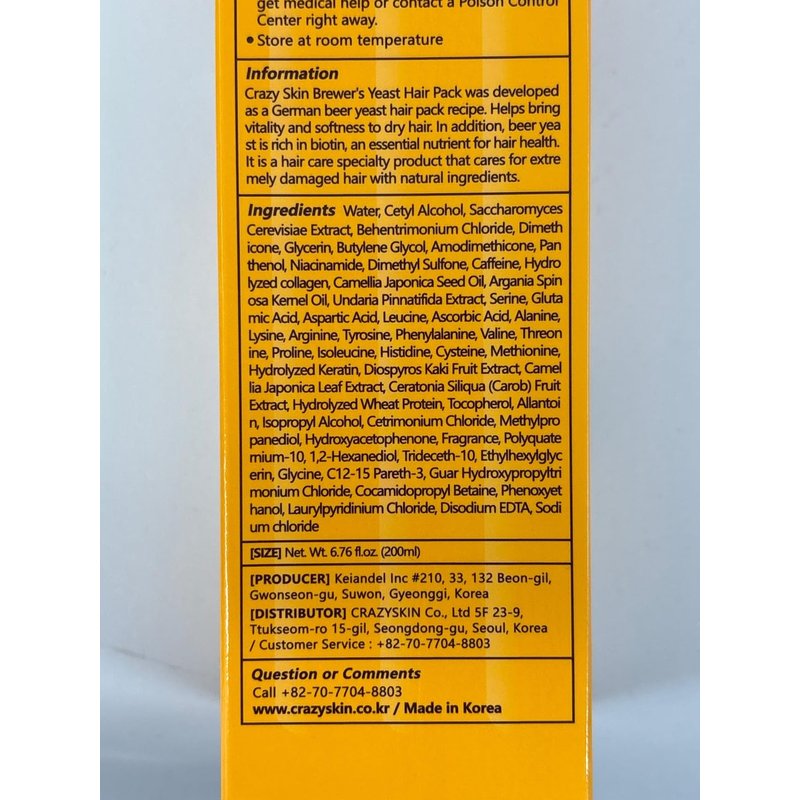 CRAZY SKIN Beer Yeast Hair Treatment Mask - pH5.5 Protein, Keratin, Argan/Camellia Oil, Collagen for Repair and Color Treated Hair 13.5oz(400ml)