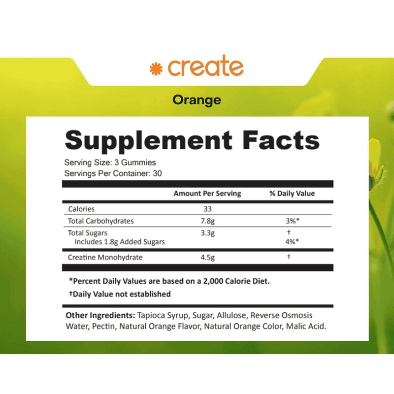 Create Creatine Monohydrate Gummies for Men & Women, Boost Focus, Strength, and Endurance, Anti-Melting Formula, Vegan, Gluten-Free, Non-GMO, 1.5g of Creatine per Gummy (Orange, 90 ct)