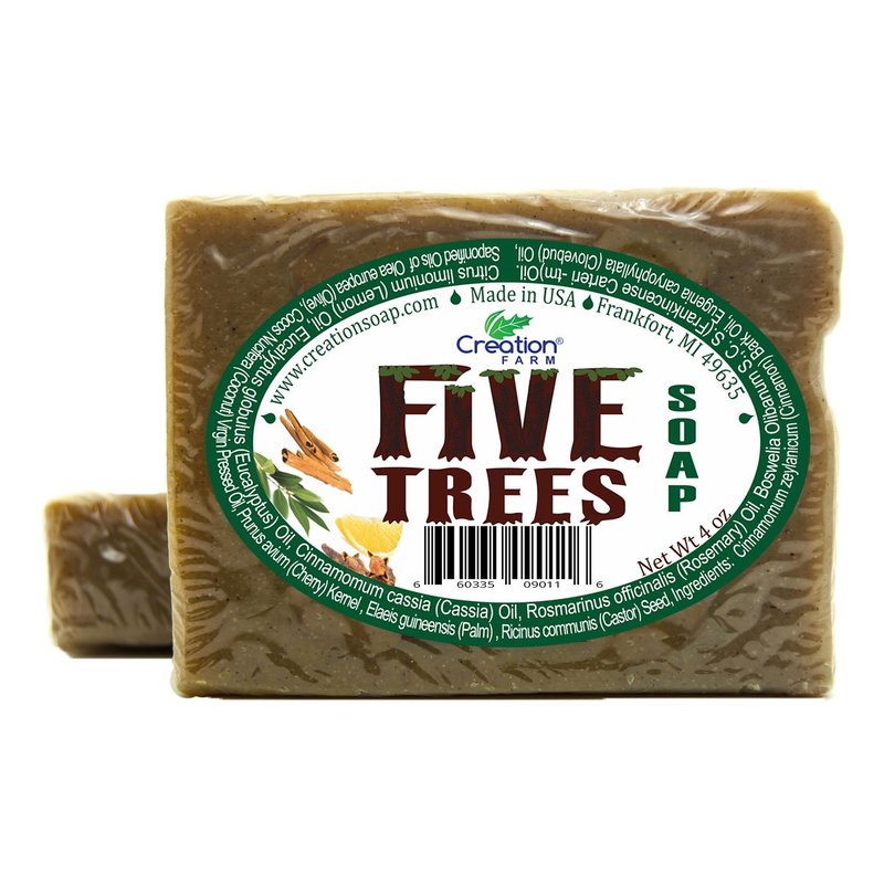 Creation Farm Five Trees Hand Crafted Soap Bars made with Aromatherapy Essential Oil Blend of Cinnamon, Frankincense, Lemon, Eucalyptus, Rosemary Clove, Wash Away Germs 8 oz. (2-4oz Bars)