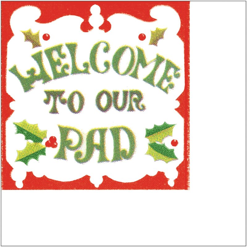 - Welcome To Our Pad in red and green with holly; great for a Christmas or holiday party