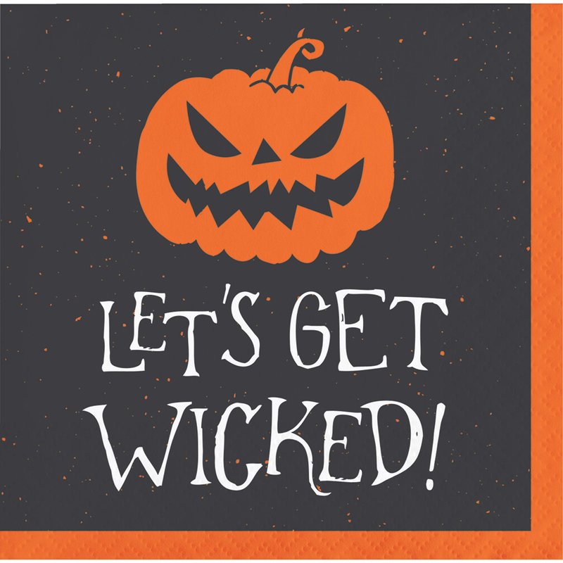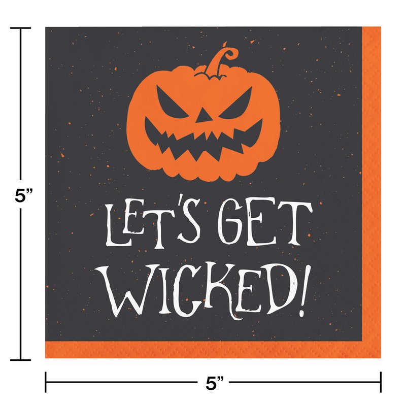 - These 2-ply napkins feature an orange jack-o-lantern design with "Let's Get Wicked" headline against a black background and orange border