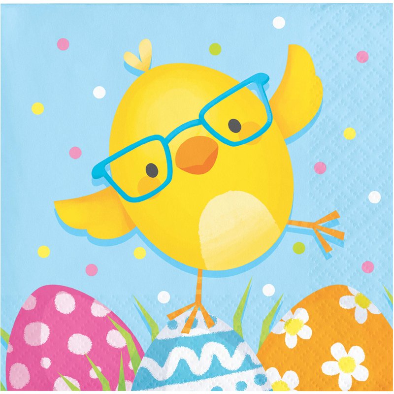 - These 2-ply napkins feature yellow chick wearing blue glasses with painted eggs below