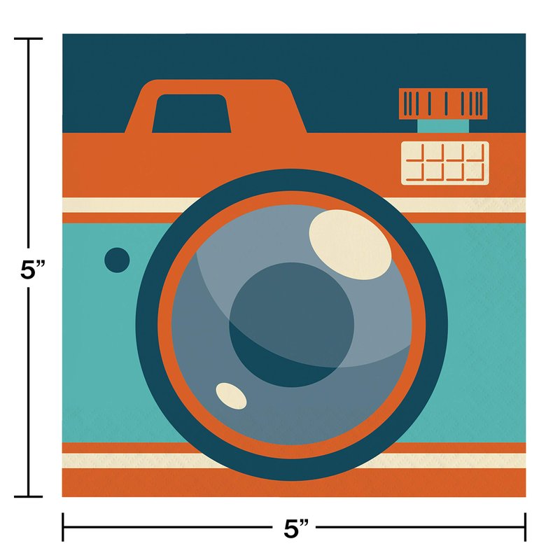 - These 2-ply napkins feature a vintage camera with a blue, orange, and teal theme