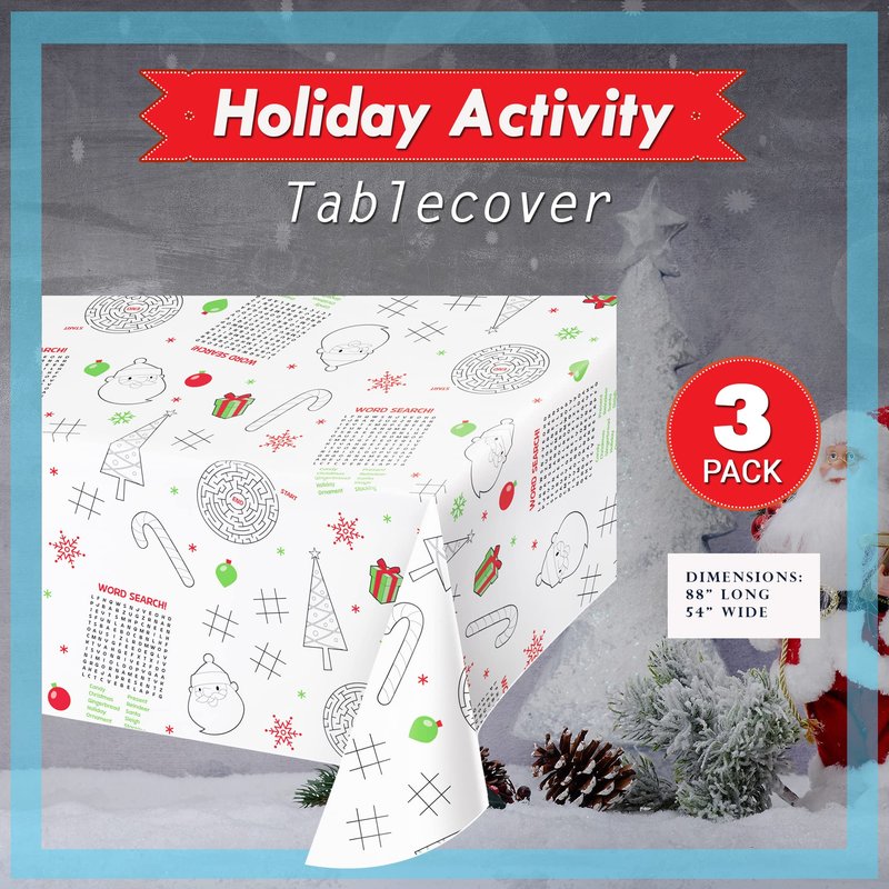 - WINTER HOLIDAY DESIGN - This set of 3 tablecloths are filled with red and green Christmas designs and activities. Each one measures 88" x 54". There is a word search, gingerbread house maze, word jumble, and a festive Santa.