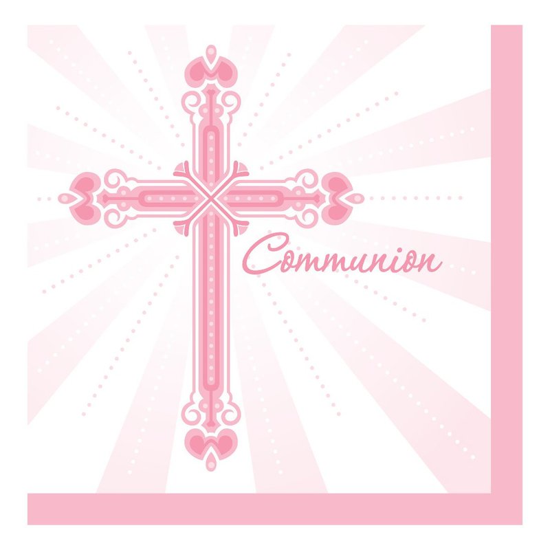 - Inspirational design features Pink cross radiating with beams of light and a Pink border, reads: Communion