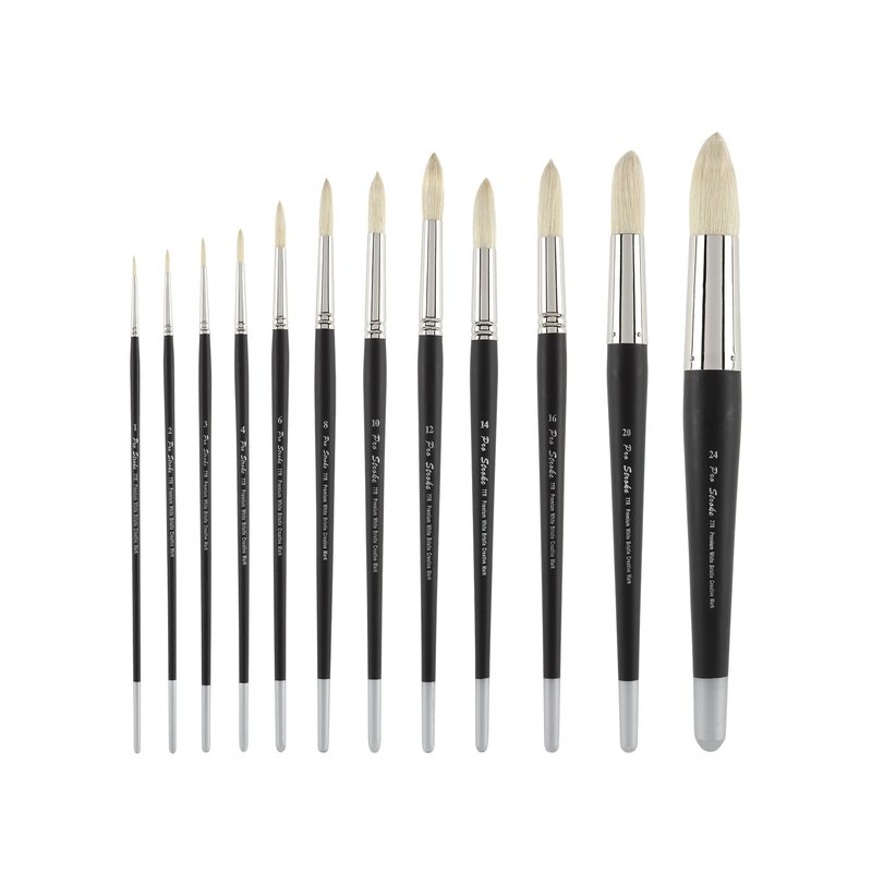 Our pro stroke premium white bristle brushes are superbly hand crafted from the finest Chungking hog bristle. The Natural inwardly curving bristles provide springy response and the flagged tips hold loads of Color for a long, full Paint stroke. SpeciAlly processed to a Unique softness, the hairs work in unison for sure strokes whether using rounds, bright, flats, or filberts. Hair is hand tied and set in seamless nickel-plated brass ferrules, glued and crimped onto balanced matte Wooden handles with dipping silver ends. Excellent for traditional and water mixable oils, they can be Used with acrylics, caseins, and alkyds. These brushes are Available in various Sizes.