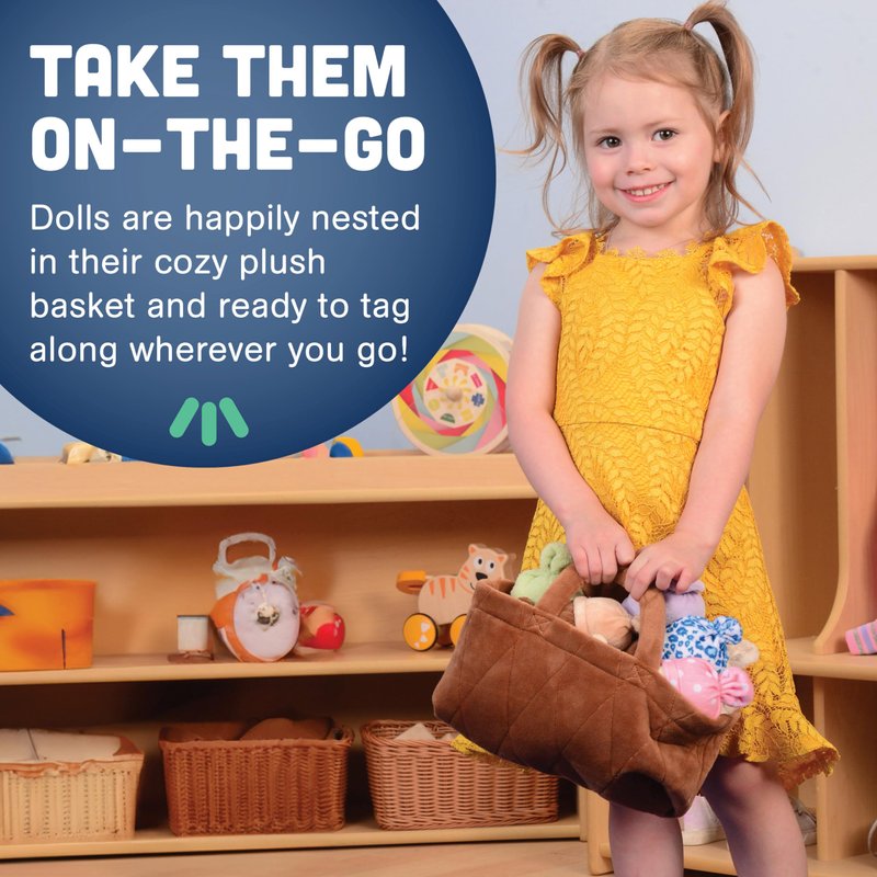 - PORTABLE: With six 10" long toy plush baby dolls in a 12” wide basket; this doll set is ideal for your home, classroom, waiting room, or any other place a child will need sensory entertainment