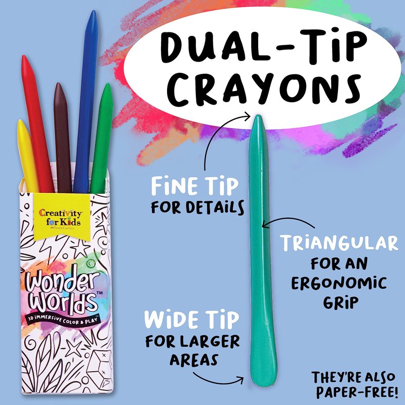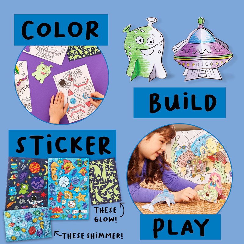 - COMPLETE KIDS COLORING KIT: Everything you need to color and create your outer space and underwater art worlds is included, just add imagination! The crafts for kids ages 5-8+ includes 12 paper-free and ergonomic triangular crayons, sticker sheets, 2-sided coloring scenes, and 8 3D toy characters