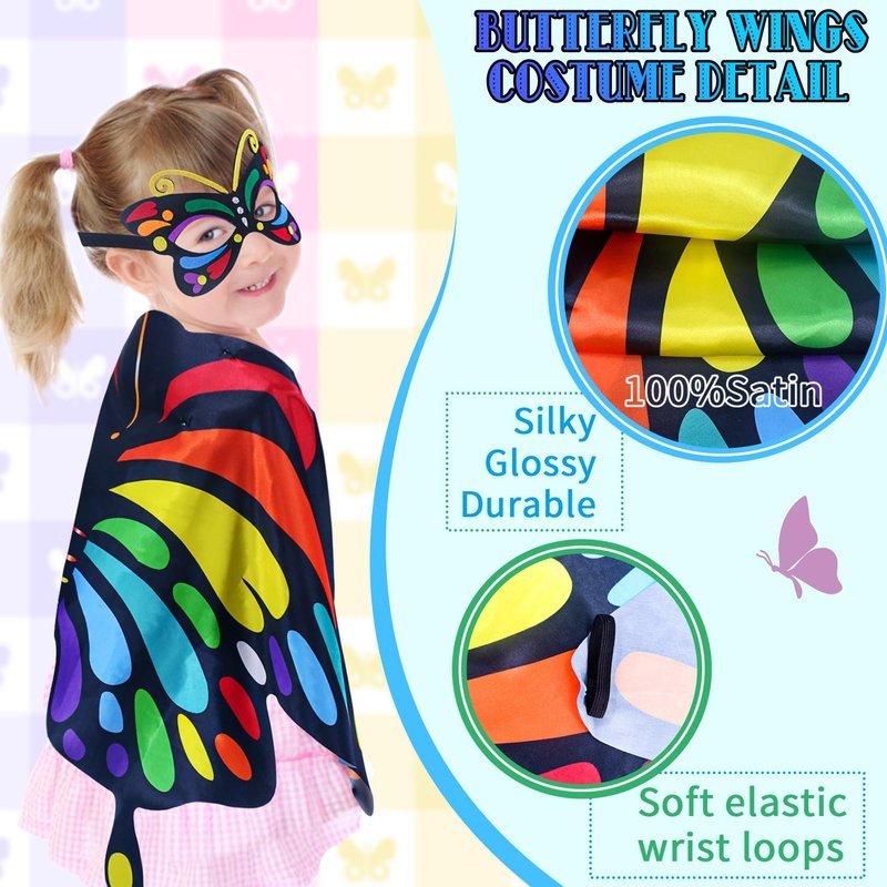 - ❀Great Gift Idea - Kids Butterfly Cape is an adorable daily accessory and admirable butterfly birthday party Gifts, more than kids Dress Up Clothes for play, perfect for Halloween, Story Role-Play, School Day, Bugs Unit, Masquerade, Birthday, Carnival etc. Butterfly Wings Kids, no rods, no wire, great for travel, outdoor activities and daily accessories.
