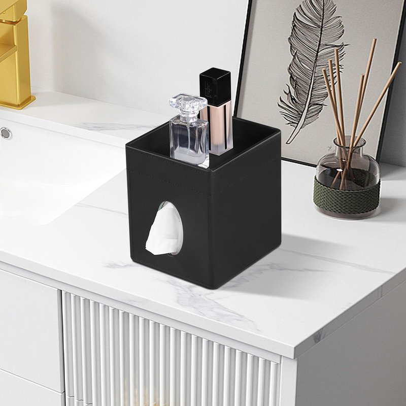 Cretkhp Tissue Box Cover, PU Leather Square Tissue Box Holder with Storage Tray for Bathroom Vanity Countertop Night Stands Bedroom Office Desk, Stylish Tissue Holder Decorative Organizer (Black)