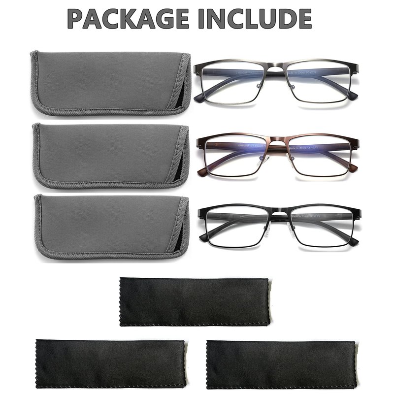 CRGATV is a professional glasses fashion company integrating R&D, production, sales and services.The company adheres to the business philosophy of combining fashion with quality, emphasizing innovation, originality and value,CRGATV has refined its vision to earn customers' recognition. 3 Pack Blue Light Blocking Stylish Reading Glasses, Full Rim Computer Reader Eyeglasses For Mens Anti UV Ray , Eyestrain & Glare Blue blocking glasses can effectively reduce the continuous damage of blue light to the eyes. After using anti-blue light glasses, the intensity of blue rays emitted by mobile phones, computers and other screens is effectively suppressed, reducing damage of harmful blue light to the eyes. Color:Black Brushedgun Brown Material : Metal Frame, AC Lens,Spring Hinges Diopters available: 1.0x 1.25x 1.5x 1.75x 2.0x 2.25x 2.5x 2.75x 3.0x 3.25x 3.5x 3.75x 4.0x Package includes: 3 x Reading Glasses + 3 x Pouches Please specify the frame color and lens strength when pay for this.Thanks! Note: Due to the difference between different monitors, the picture may not reflect the actual color of the item. Thank you! Size for manual measurement, there may be a 0 to 0.5 cm error, belongs to the normal phenomenon.