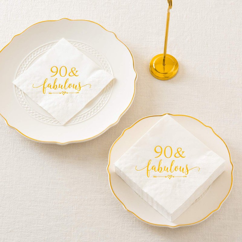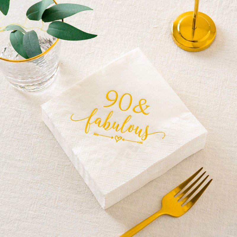 - SET INCLUDES: 50 highly absorbent 3-ply napkins made from paper featuring a Happy 90th Anniversary theme with "90 and fabulous" imprinted with gold foil.