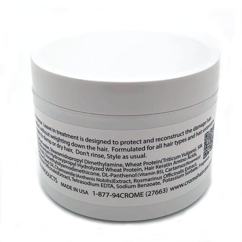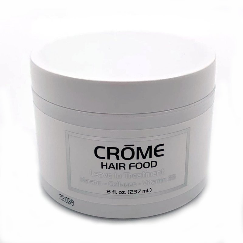 Crome Hair Food A 16 oz Keratin Leave-In Conditioner Hair Treatment Leave-in collagen, and vitamin B. Perfect for over-processed hair restoring silkiness, vitality, and elasticity. Recommended for all hair type hair extensions and with polish for straightener process with flat iron.