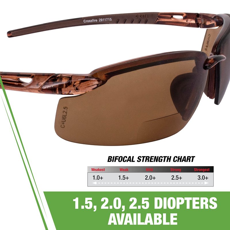 - These ES5 Safety Glasses by Crossfire feature an HD brown flash mirror lens with a 1.5 diopter bifocals