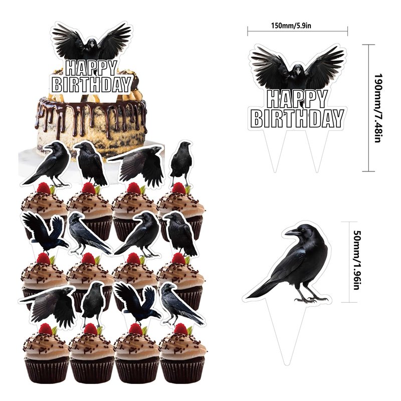 - Crow Birthday Party Supplies Set Package includes: You will get 1 * HAPPY BIRTHDAY banner, 18 * balloon (3 styles of 6 each), 1 * cake topper, 12 * cupcake topper, each accessory has crow elements, these party decorations will bring more fun to your party