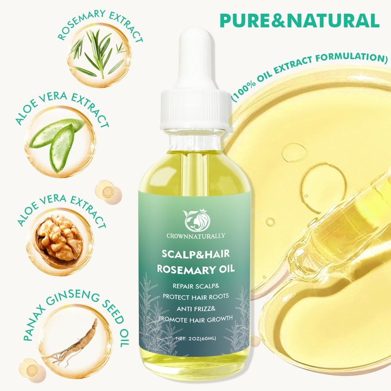 CrownNaturally 2 oz Rosemary Essentials Oil for Hair Growth &Dry Scalp Treatment with Shampoo Brush for Head Massage Organic Hair Care Set for Repairing Scalp and Reduce Hair Loss