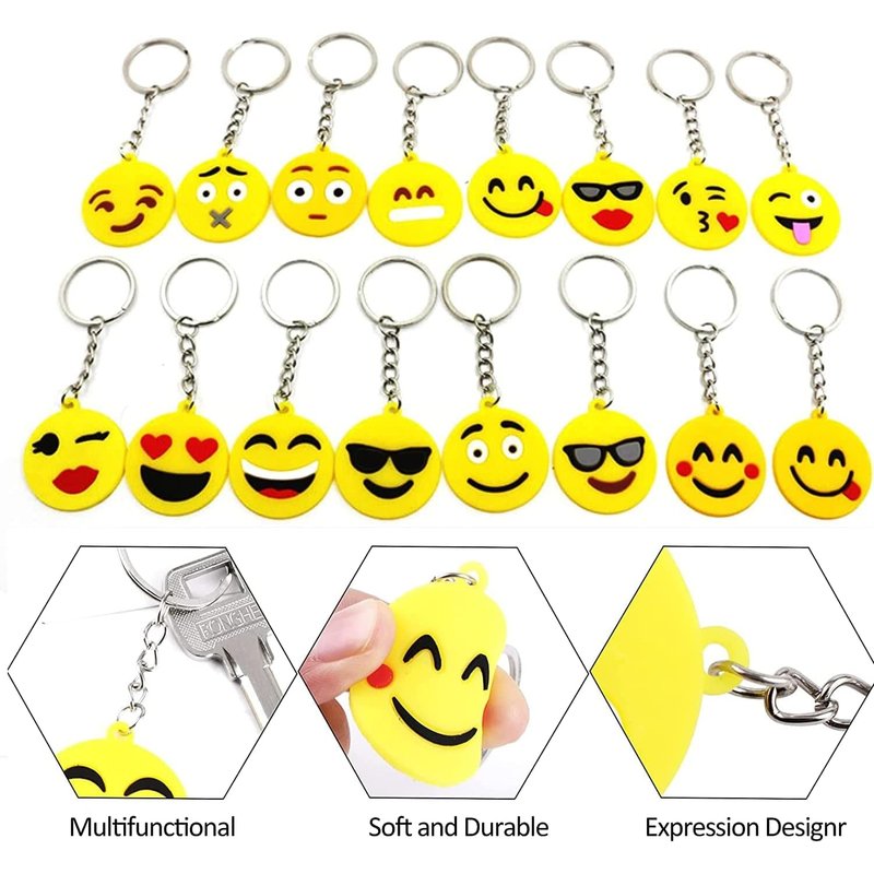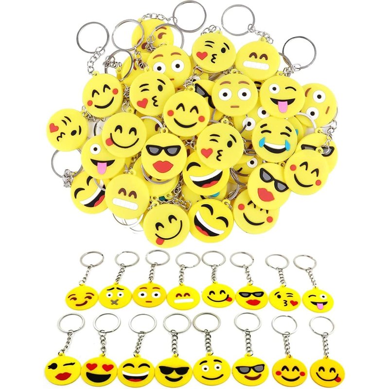 - 【Different】32pcs smile keychain. Package includes 16 different emoticon keychains, 2 for each expression,representing your various emotions.Diameter about 3.5 CM.Contains: smile, laugh, devil, monkey, kiss, heart, glasses, and other funny emoticon.