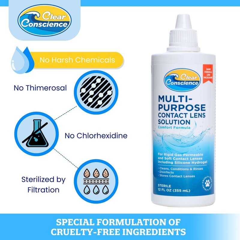 - VEGAN CONTACT SOLUTION – 100% vegan ingredients & cruelty-free. Clear Conscience contact lens solution is never tested on animals. We donate 10% of proceeds to animal welfare organizations– join us in making our world a better place for all animals!