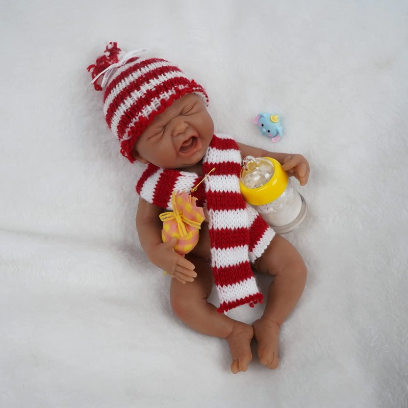 Crying Baby Reborn Baby Doll Black,7" Silicone Doll Mini Realistic Newborn Baby Dolls Silicone Full Body Stress Relief for Feeding Accessories Gift Box(Boy)
