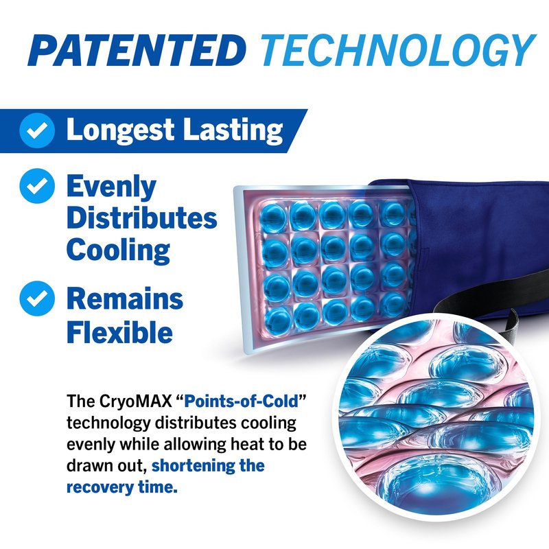 - ULTRA LONG LASTING- CryoMAX uses patented Points-of-Cold technology to stay cold for up to 8 hours! No need to return to the freezer repeatedly. Other cold packs can't keep up!
