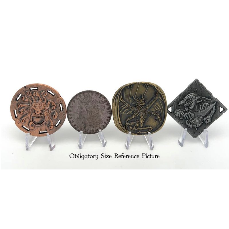 Don't leave fate to a common coin of the realm. Carry a coin that reflects your love of role-playing games and the amazing characters that inhabit them. Great art designs with a very obvious heads or tails. Challenge coin size and weight (approximately 45mm or 1.77" - 3mm thick - 1.2 oz or 34 grams. Made from solid zinc alloy and finished with antique silver plating.