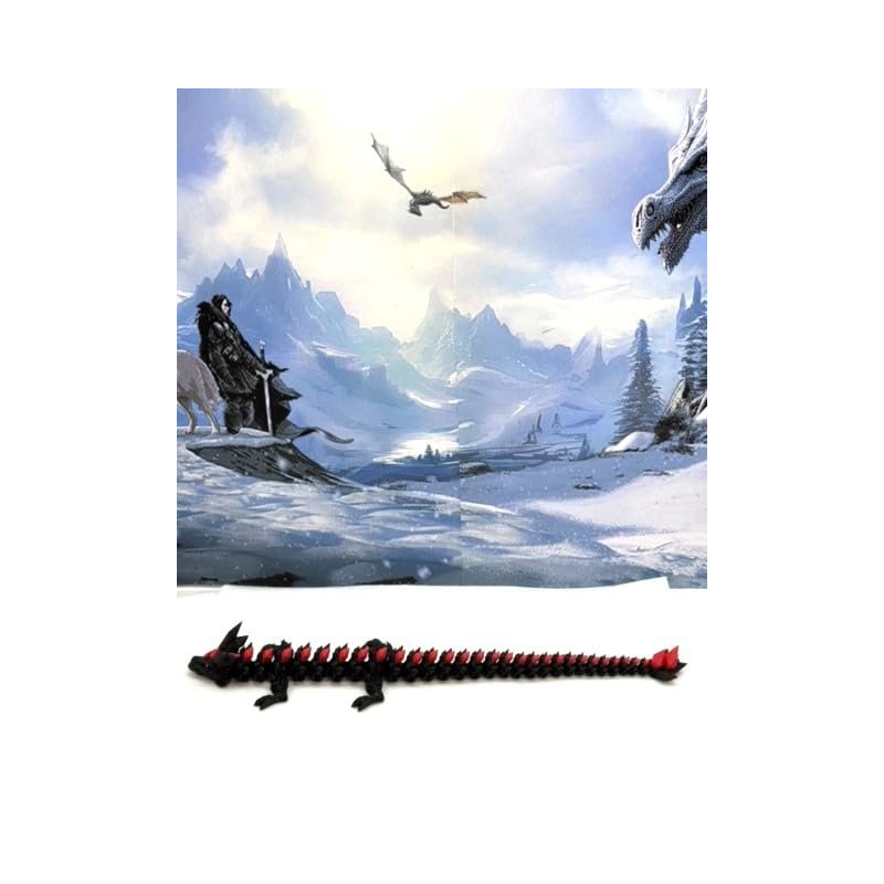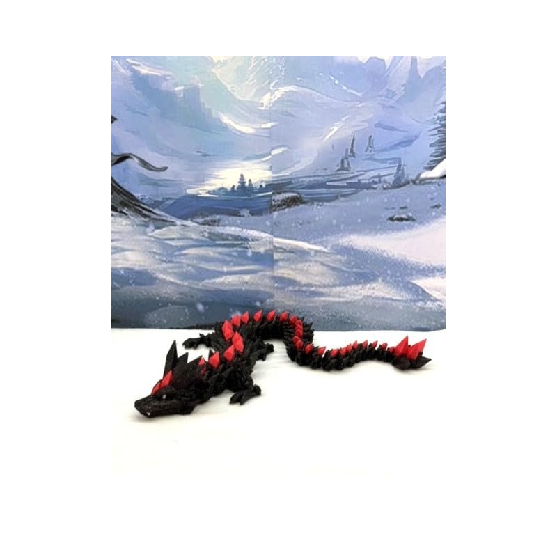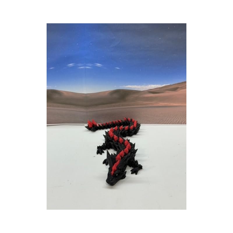 3D Printed enchanting Articulated Black and Red Crystal Dragon - a mystical creature that brings a touch of fantasy to your world. Unveil the mystery of this Black and Red Crystal Dragon ( measures 12" long) a captivating fusion of elegance and fantasy. this dragon reveals itself with a symphony of colors - a testament to its magical heritage. ------- Small Components Advisory: ------- Please note that this product may contain small components and might not be suitable for very young children. Given the characteristics of 3D printing, there is a potential for small components to detach if handled aggressively or dropped. Therefore, we advise against allowing younger children to interact with the dragon. Please consider that 3D printed objects might include minor imperfections such as layer lines. These are a natural and inherent aspect of the printing process. We strive to produce the highest quality items, and these imperfections contribute to the unique character of each piece. Recall the unique creation of each dragon, crafted exclusively for you. The color selections available are depicted in the provided photos. Please be aware that variations in color may occur due to discrepancies in filament production and the characteristics of the monitor or screen you are utilizing to view the listing. Additionally, the arrangement of prints using multi-colored filament rolls can influence color distribution. ------- Licensing Information: ------- Authorized Design: NOHo3D holds the official authorization for the production of this exquisite design created by CinderWing3D.