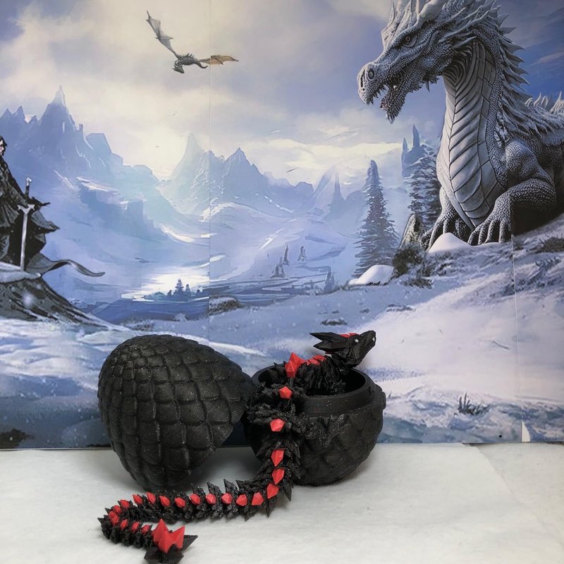 3D Printed enchanting Articulated Black and Red Crystal Dragon - a mystical creature that brings a touch of fantasy to your world. Unveil the mystery of the Galaxy Dragon Egg and this Black and Red Crystal Dragon ( measures 12" long) a captivating fusion of elegance and fantasy. Encased within a meticulously designed crystal egg, this tiny dragon reveals itself with a symphony of colors - a testament to its magical heritage. ------- Small Components Advisory: ------- Please note that this product may contain small components and might not be suitable for very young children. Given the characteristics of 3D printing, there is a potential for small components to detach if handled aggressively or dropped. Therefore, we advise against allowing younger children to interact with the dragon. Please consider that 3D printed objects might include minor imperfections such as layer lines. These are a natural and inherent aspect of the printing process. We strive to produce the highest quality items, and these imperfections contribute to the unique character of each piece. Recall the unique creation of each dragon, crafted exclusively for you. The color selections available are depicted in the provided photos. Please be aware that variations in color may occur due to discrepancies in filament production and the characteristics of the monitor or screen you are utilizing to view the listing. Additionally, the arrangement of prints using multi-colored filament rolls can influence color distribution. ------- Licensing Information: ------- Authorized Design: NOHo3D holds the official authorization for the production of this exquisite design created by CinderWing3D.