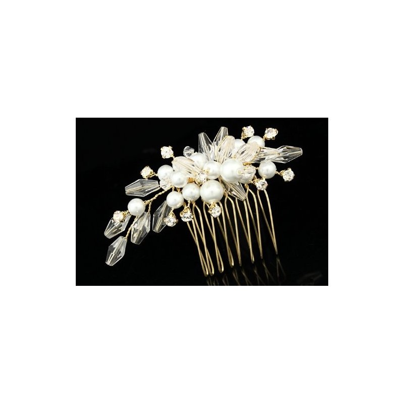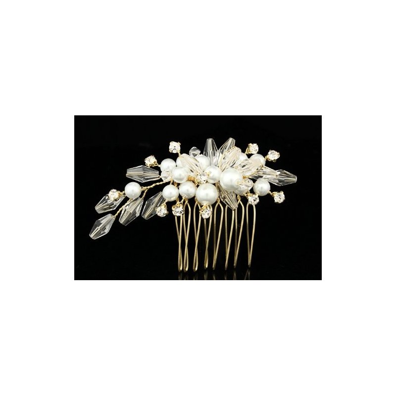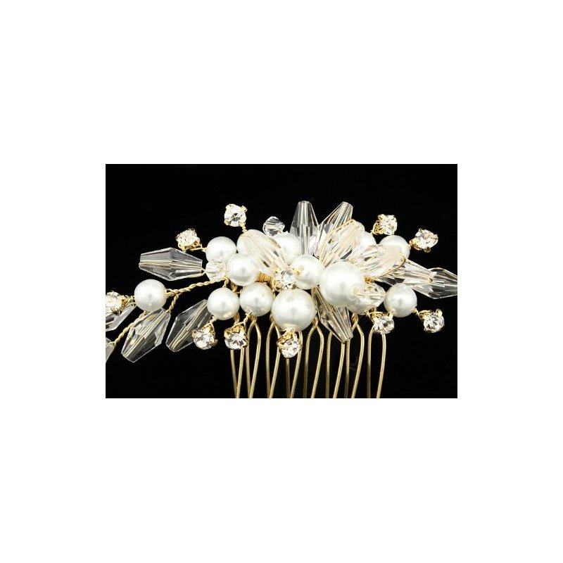 Crystal Pearl Flower Bouquet Bridal Wedding Tiara Hair Comb - Gold Plated Rhinestone Crystals Faux Pearls FC038