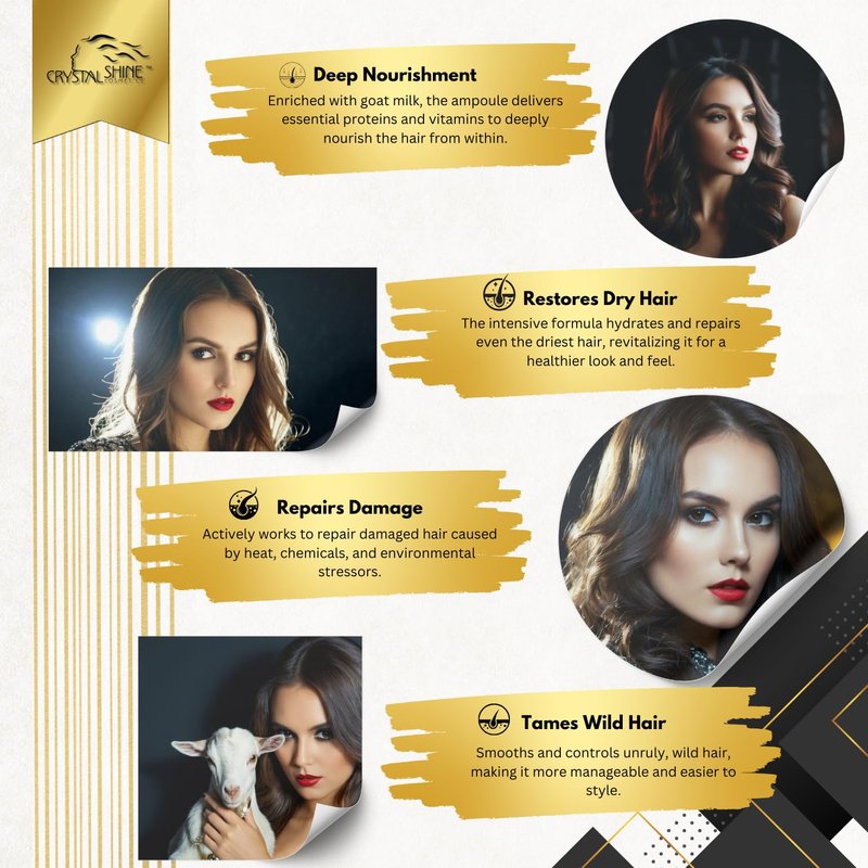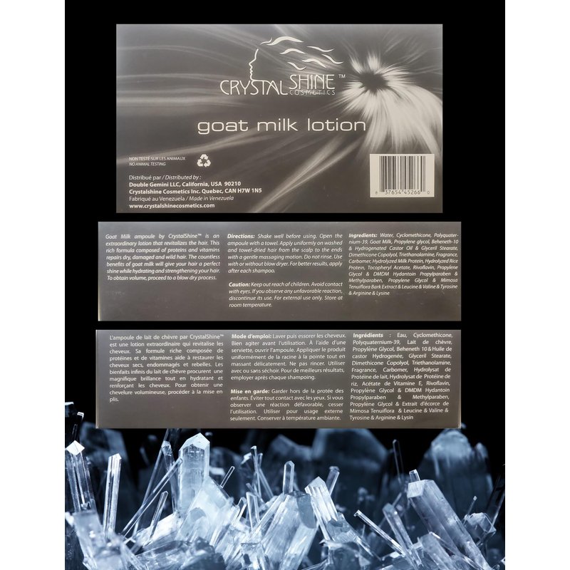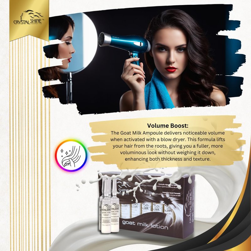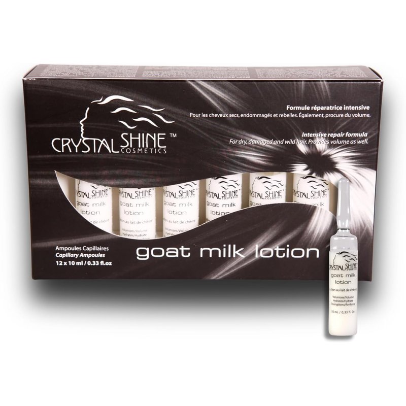 CrystalShine Goat Milk Hair Ampoule (12 Pack) (10 ml/each) Intensive Repair for Dry, Damaged & Wild Hair - Shine, Strength & Volume Experience the transformative power of goat milk! CrystalShine's luxurious hair ampoule is formulated with a rich blend of proteins and vitamins to revitalize dry, damaged, and unruly hair. This intensive treatment deeply hydrates, strengthens, and repairs, leaving your hair with a healthy shine and manageable volume. Benefits: - Repairs dry, damaged, and wild hair - Infused with goat milk for intense hydration and nourishment - Strengthens hair for improved manageability - Adds shine for a healthy, radiant look - Promotes volume after blow-drying for a fuller appearance