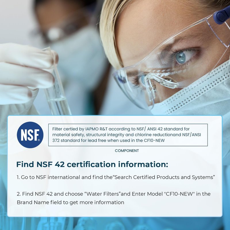- Crystala CF16 LT1000PC Water Filter Statement: The materials and construction are in compliance with the NSF42 standard. After our laboratory tested, refrigerator water filter to remove 97.9% chlorine and improves water’s smell and taste. Find NSF 42 Standard information: Go to NSF’s database, enter the certified model number “CF16” or manufacturer "Ningbo Pureza Technology, LLC". If you find that the product is not NSF42 certified, you can claims identified in the NSF listing.